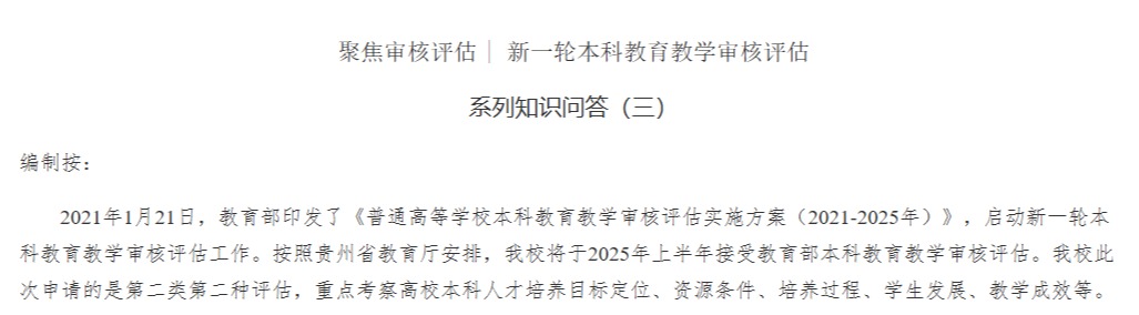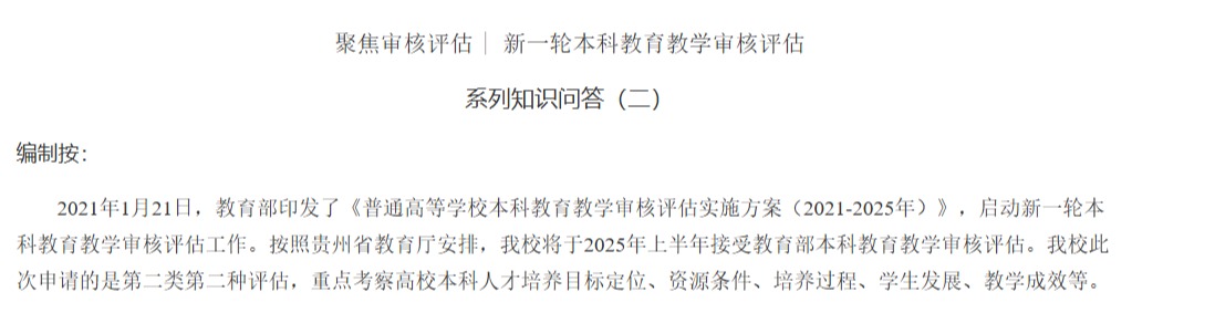 聚焦审核评估 | 新一轮本科公司产品审核评估系列知识问答(三)编制按:2021年1月21日,教育部印发了《普通高等公司本科公司产品审核评估实施方案(2021-2025年)》,启动新一轮本科公司产品审核评估工作。按照贵州省教育厅安排,公司将于2025年上半年接受教育部本科公司产品审核评估。公司此次申请的是第二类第二种评估…