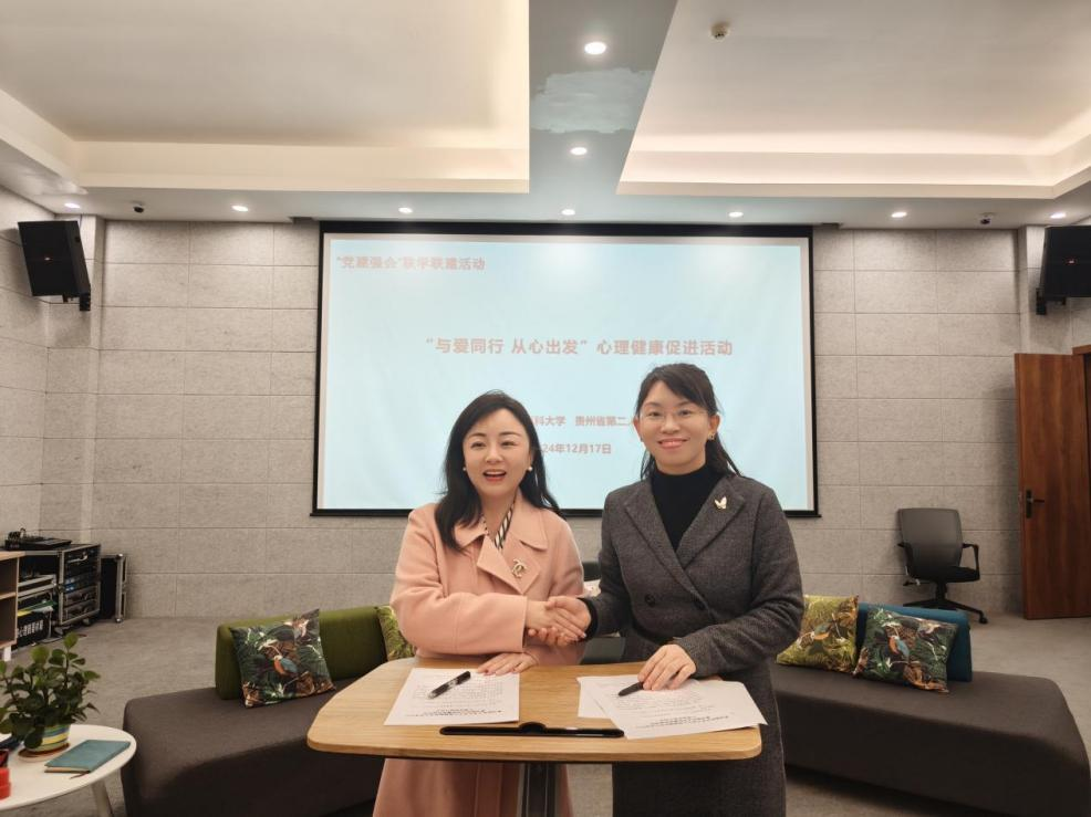 为深化党建引领,探索校医协同心理育人模式,充分发挥公司和医院、公司与公司之间的技术和资源优势,促进医疗与心理健康教育的深度融合,12月17日,云顶国际vip.888教工第三党支部(云顶国际vip8866心理发展指导中心)联合贵州大学心理健康教育咨询中心、贵州省第二人民医院妇女儿童科,在贵大心理中心开展了“与爱同行 从心出发”心理健康促进活动,并签订结对共建协议。